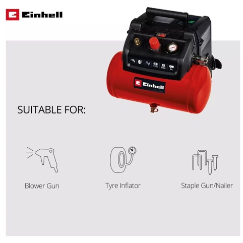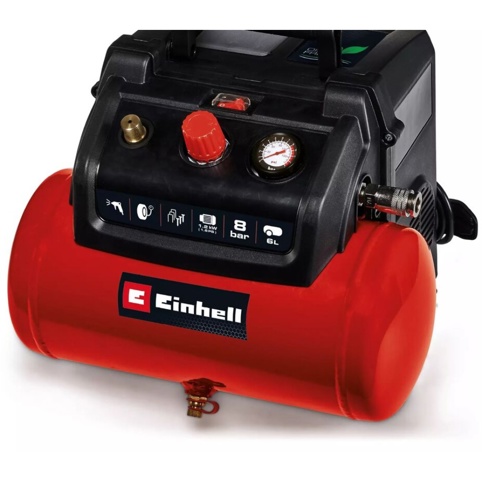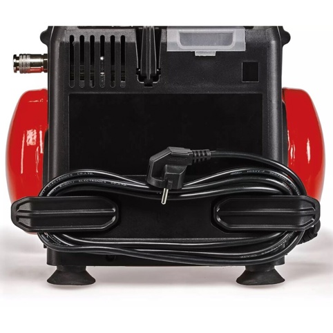 Tryklufttanken på 6 liter sikrer en stabil luftforsyning, mens lynkoblingen gør det hurtigt og enkelt at skifte trykluftværktøj. Kompressoren har praktisk kabelopbevaring, integreret plads til tilbehør og en robust konstruktion med stabile fødder, der gør den nem at anvende i dagligdagen. Den er desuden nem at transportere og takket være tømningsskruen, er rengøring og tømning enkel. Einhell yder 10 års garanti mod gennemtæring af kedlen.