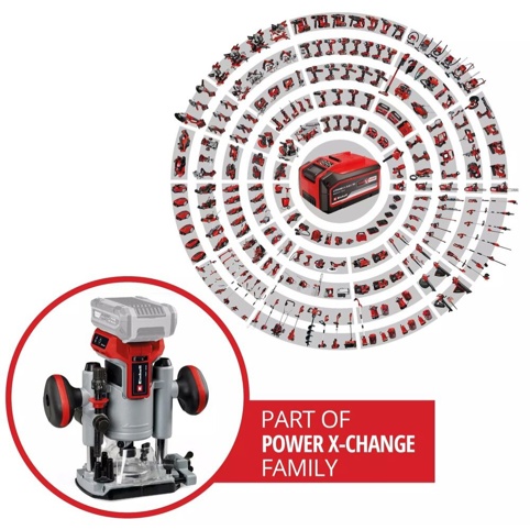 Overfræseren er en del af Einhells effektive batterisystem 18 V Power X-Change. Det betyder, at du kan bruge de samme batterier til alle Einhell-maskiner med tilsvarende batterisystem og spænding (V). Der medfølger ikke batteri til denne maskine, så du kan enten bruge et PXC-batteri, du har i forvejen, eller du kan tilkøbe et batteri separat. Med maskiner fra samme batterisystem kan du spare både ressourcer, penge og tid, når du ikke skal købe og opbevare mange forskellige batterier eller vente på en opladning.