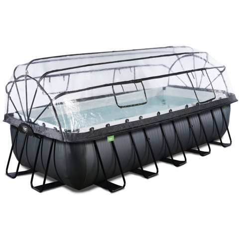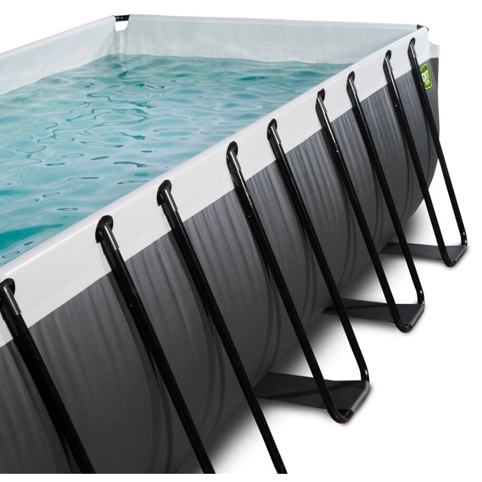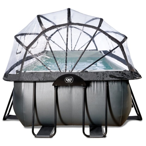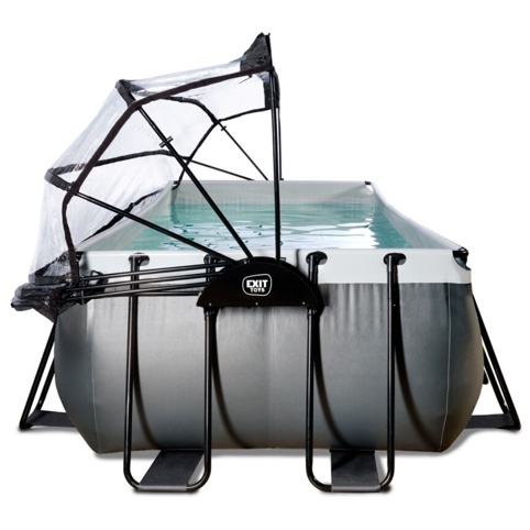 Mangler du en ny pool til haven? Så kan du her finde denne flotte pool fra Exit Toys, som har et smart pooltag. Taget er praktisk til dage, hvor børnene gerne vil bade, men vejret er dårligt, for det er muligt at bade i bassinet under taget. Den har et flot lædermønster på ydersiden og en flot grå farve på indersiden. Siderne er 3 lag af PVC og polyester.