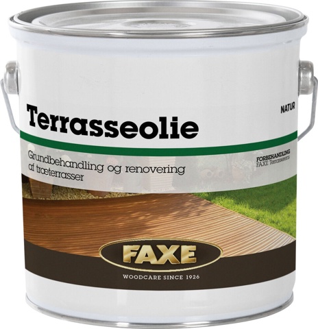 Det er vigtigt at vedligeholde en træterrasse jævnligt, da træ udendørs udsættes for meget slitage – det kan f.eks. være i form af sollys, fugt og skiftende temperaturer. Hvis du husker at behandle træet en gang imellem, kan du bevare bræddernes naturlige farve og glød og holde fugt ude af træet. Med FAXE Terrasseolie får du en olie, der skal anvendes udendørs til grundbehandling og vedligeholdelse af træterrasser. Træolien er lavet af planteolie, lysægte pigmenter og aktive stoffer, og den kan også bruges til havemøbler af træ.