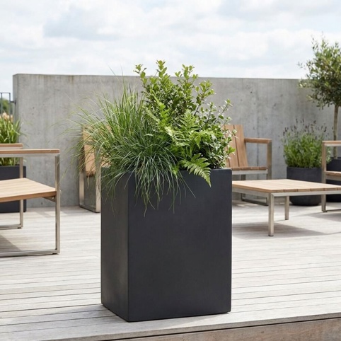 Fiberkrukken er i farven sort og fås i forskellige størrelser. Du kan med fordel kombinere forskellige størrelser med hinanden – så kan dine planter nemlig stå i flere niveauer, hvilket giver dit udendørsområde et personligt og unikt udtryk.