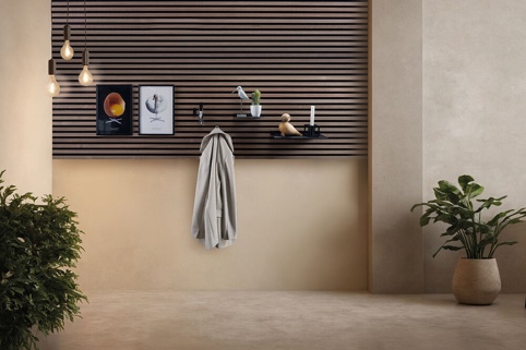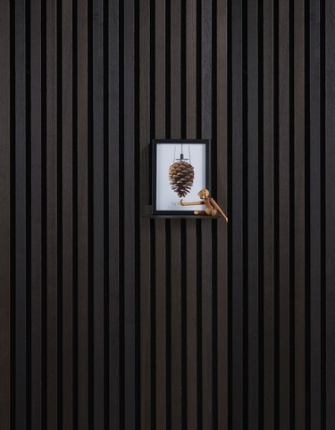Tilføj FibroTechs hylde til dit akustikpanel, så du kan få udnyttet panelets vægplads og indrette med dekorationer, lys, billeder eller andet for en hyggelig, hjemlig stemning, der samtidig er stilfuld. Hylden har nemlig et slankt, minimalistisk ståldesign, der giver en flot kontrast til akustikpanelets trælook.