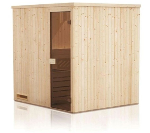 Du får her en sauna, som er fremstillet af ubehandlet nordisk gran, som derfor giver den en super-flot naturfarve, som derfor nemt vil passe ind i alle boliger. Derudover har væggene og taget en rammekonstruktion af mineralsk isolationsuld og dampspærre. Lågen er af bronzeret helglas med hærdet sikkerhedsglas. Du behøver ikke give saunaen træbeskyttelse eller behandling, da den er egnet til indendørsbrug. Ved montering skal der holdes en afstand på 10 cm til væg og loft.