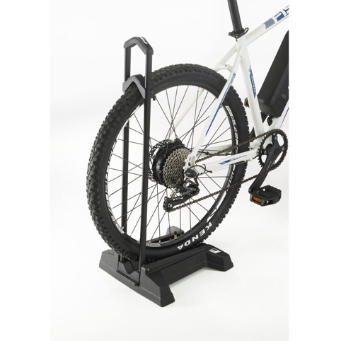 Stativet er sammenklappeligt og kræver ingen montering, hvilket gør det nemt at opbevare, når det ikke er i brug. Den brede fod og justerbare dækholder giver ekstra stabilitet, og der er mulighed for fastmontering i gulvet, hvis du ønsker en permanent løsning (monteringsudstyr medfølger ikke). Cykelstativet har en højde på 87 cm.