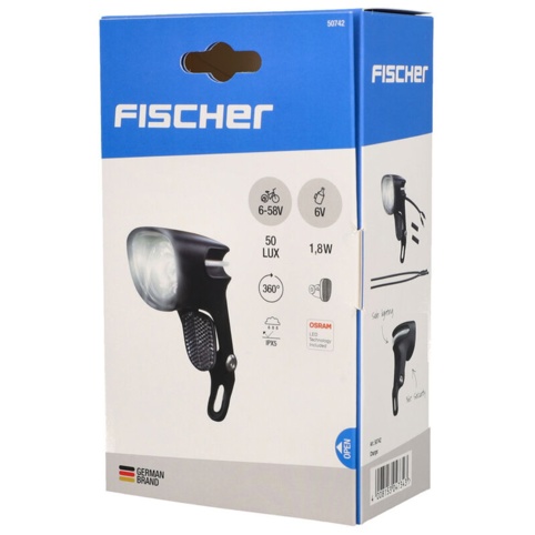 Fischer Ebike-forlygten er udviklet til elcykler og el-løbehjul, som ofte kører lidt hurtigere og derfor har behov for ekstra kraftig belysning. Med en lysstyrke på 50 lux oplyser lygten effektivt mørke stier og veje. Forlygten tilkobles cyklens forsyningsspænding og kan anvendes med 6-58 V, dog kan den ikke lyse helt så kraftigt, når den bruges ved 6 V.