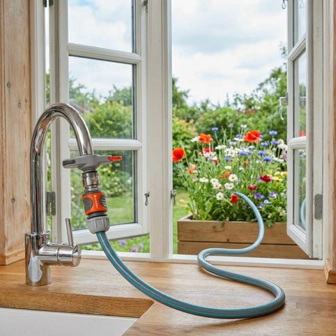 Med Gardena Adapter til indendørs vandhaner, kan du nemt få vandet dine planter på verandaen eller terrassen. Denne Adapter kan nemlig tilsluttes til en indendørs hane, f.eks. i køkkenet eller badeværelset, og du er derfor fri for at slæbe rundt på de tunge vandkander.