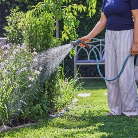 Sprøjtepistolen er designet med fokus på komfort og brugervenlighed. Den ergonomiske udløser kan låses under brug, så du undgår at belaste hånden ved længerevarende vanding eller rengøring. Samtidig sikrer den trinløse justering af vandmængden, at du nemt kan tilpasse vandstrømmen fra fuld kraft til en mere blid forstøvning – alt efter opgaven.