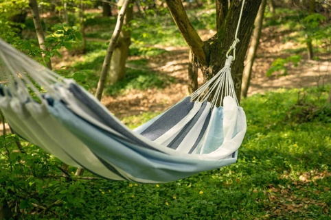 Hængekøjen kan placeres i haven, på terrassen eller tages med på tur – f.eks. på campingpladsen. Den har en maksimal belastning på 150 kg. Der medfølger ikke beslag til montering.