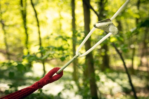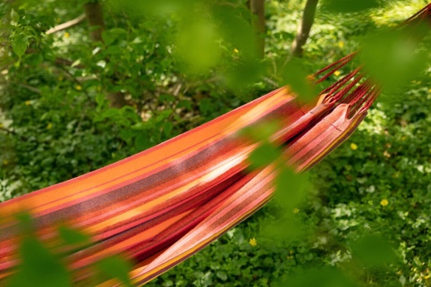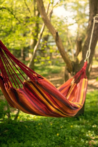 Hængekøjen kan placeres i haven, på terrassen eller tages med på tur – f.eks. på campingpladsen. Den har en maksimal belastning på 120 kg. Der medfølger ikke beslag til montering.