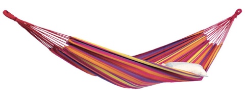 Denne hængekøje med tværstang måler L: 310 cm x B: 100 cm og er lavet af UV resistent EllTex. EllTex står for ’Elastic textile’ – et specialudviklet materiale, som er meget UV-resistent og vejrbestandigt. Materialet bruges især i udendørs hængekøjer, hvor man ønsker følelsen af bomuld, men med langt bedre modstandsdygtighed over for sol og vejr. Hængekøjen holder sig derfor flot hele året rundt. Den er i farverne gul, pink, rød og lilla.
