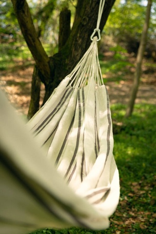 Denne hængekøje måler L: 360 cm x B: 150 cm og er fremstillet af genbrugsbomuld og polyester. Hængekøjen kan placeres i haven, på terrassen eller tages med på tur – f.eks. på campingpladsen. Den har en maksimal belastning på 200 kg. Der medfølger ikke beslag til montering. Hængekøjen er i farven beige og er med sorte striber.