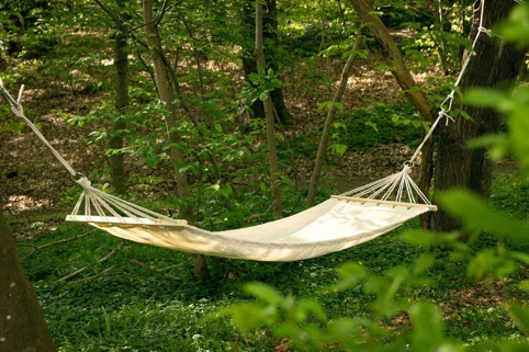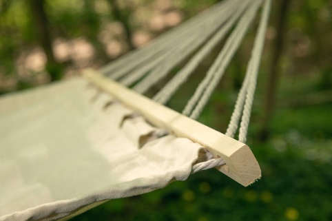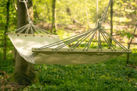Beigefarvet hængekøje, som er perfekt til læsning og eftermiddagslure