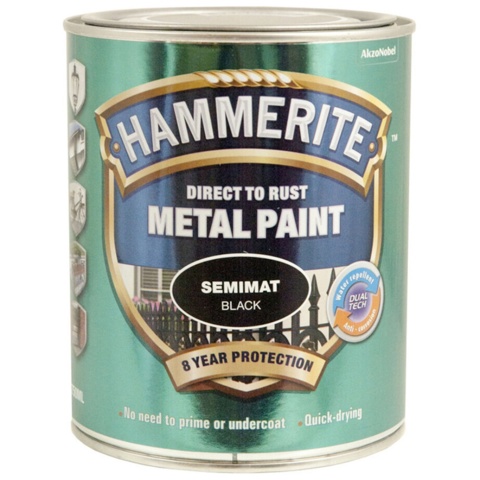 Udholdende, rust-bestandig og dekorativ maling til jernholdige og ikke-jernholdige metaller. Malingen kan også bruges til visse plast-typer og træ. Hammerite-malingen kræver ingen grunder eller primer, så du behøver blot sikre dig, at overfladen er ren og helt tør, før du tilføjer malingen. Malingen har en subtil og glat satin-finish. Kan påføres direkte på rustent metal. Metal-malingen danner en overlegen barriere, der ikke blot forsegler fugt, men giver langvarig beskyttelse både indenfor og udenfor.