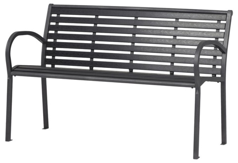 Denne simple og stilrene bænk er perfekt til entreen, haven, terrassen eller altanen. Dimensionerne på bænken er L: 124 cm x B: 60 cm. Bænken er fremstillet i metal og sort polywood, som er et plastmateriale. Bænken har en maks. belastning på 240 kg. Polywood er modstandsdygtigt over for sol, regn, fugt og frost. Du behøver blot at bruge en fugtig klud med mild sæbe til at gøre bænken ren.