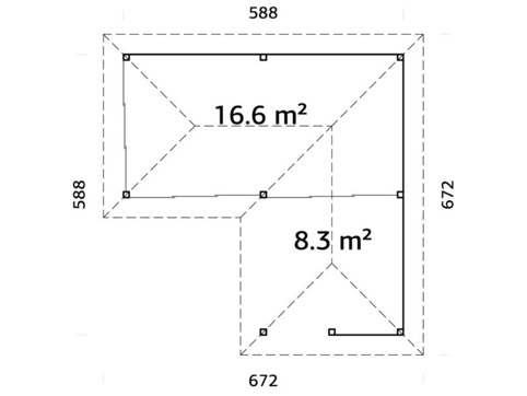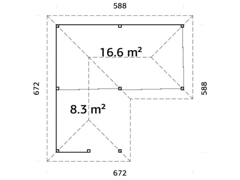 Havehuset er af ubehandlet nordisk gran, hvor spærene er af lamineret træ. Husets vægmål er B: 588 cm x D: 588 cm x H: 319 cm. Tagbrædderne er med fer/not, og de er 19 mm tykke. Vægtykkelsen er 28 mm. Produktet er FSC®-mærket. OBS! Tagpap og gulv medfølger ikke og skal tilkøbes separat.