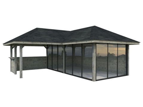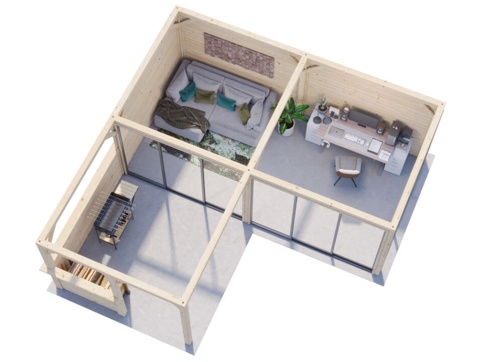 Huset er perfekt til ekstra hus i haven, ved sommerhuset o.l. Du kan pynte med havemøbler under overdækningen og selve rummet kan du bruge som kontor, ekstra soveværelse - de store vinduer vil hjælpe til at give smukt lys i rummet.