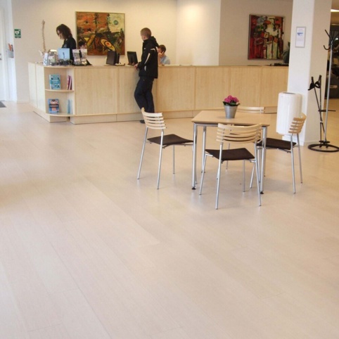 LamelPlank fra Holse & Wibroe er et elegant bambusgulv af flotte, brede planker. Natur-bambusgulvet er et meget lyst og stringent gulv, der passer rigtig godt ind i den lyse, skandinaviske bolig. Gulvet er behandlet med en mat, vandbaseret UV-lak fra Bona i en hvid farve, der er med til at give gulvet sit lyse udseende.