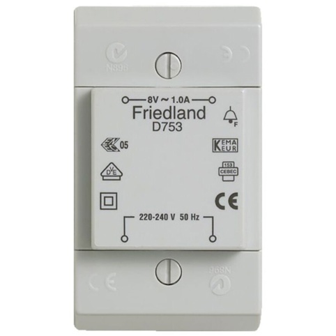 Skal du have installeret en ringeklokke? Så kan det være, du får brug for en transformer som denne. De fleste ringeklokker har nemlig et strømforbrug, som er væsentligt mindre end de typiske 230 V. Transformeren omdanner 230 V til 8 V/1 A, som er mere passende for ringeklokker. Den skal monteres på væg.
