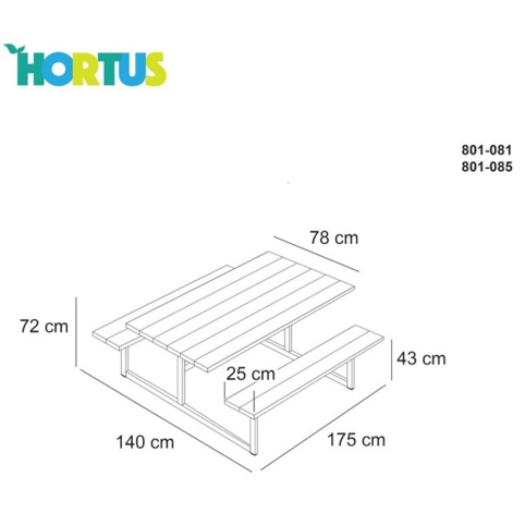 Det færdigsamlede Hortus Ydun-sæt måler H: 75 cm x B: 140 cm x L: 175 cm, og har en indbygget bordplade, som måler 78 x 175 cm. De indbyggede bænke måler H: 85 cm x B: 25 cm x L: 175 cm, som giver plads til op til 6 personer ved bordet. Hvis behovet opstår, kan du tilføje 1 stol ved hver af bordenderne, som giver dig 2 ekstra pladser. Bænkene har en siddehøjde på 44 cm. Træet er PEFC-certificeret.