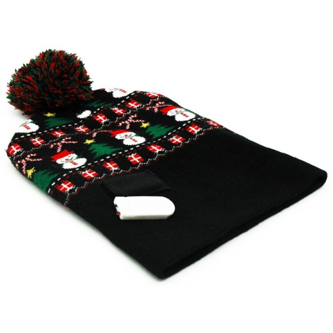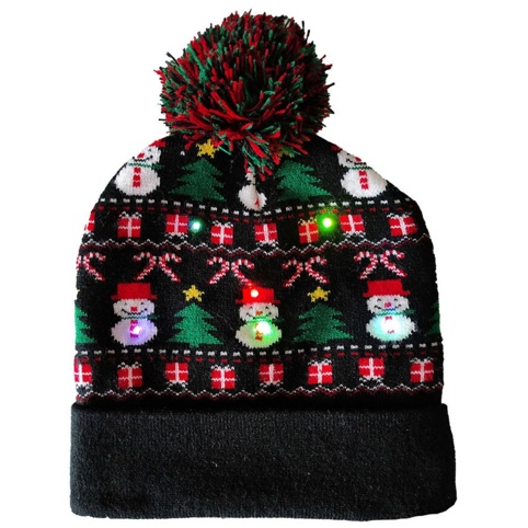 Sæt kulør på vintermørket med denne sjove og festlige blinkende beanie. Den sorte hue er pyntet med glade snemænd, juletræer og gaver – og den forvandler sig til et ægte lysshow med de indbyggede LED-lys, der blinker. Huen er lavet i et elastisk materiale, så den passer komfortabelt til både børn og voksne (fra ca. 4 år og op). Batterier medfølger og kan nemt udskiftes. En garanti for smil og juleglæde – uanset alder.