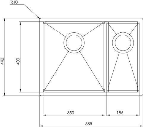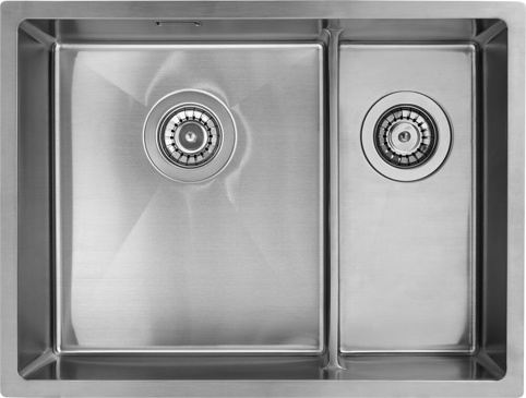 Det er smart at have en køkkenvask med flere kummer, da du så kan ordne forskellige køkkenopgaver samtidigt. I denne køkkenvask er der 1,5 kumme, hvilket betyder, at der er en stor kumme (350 mm x 400 mm) og en lille kumme (185 mm x 400 mm) med en tynd og lav væg mellem sig. Denne model har den store køkkenvask til venstre. Køkkenvasken måler i alt 585 x 400 mm.