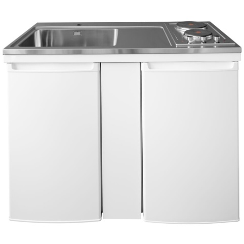 Mangler du et fuldtudstyret minikøkken til f.eks. kollegieværelset, kolonihaven eller sommerhuset? Så er denne model fra Intra Juvel et rigtigt godt valg. Minikøkkenet er lavet i et moderne og praktisk skandinavisk design, der passer ind i de fleste hjem. Der er en stor køkkenvask på 520 x 380 x 180 mm indbygget, hvor du kan forberede maden og tage opvasken. Samlet måler minikøkkenet H: 900 mm x B: 1200 mm x D: 610 mm.