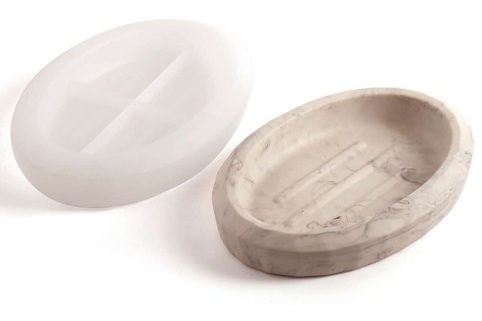 Med denne Jesmonite-silikoneform kan du støbe dine egne DIY-projekter. Det kunne f.eks. være jesmonite, resin, gips m.v. Støbeformen er af silikone, så den er nem at håndtere og arbejde med. Formen bliver til en sæbeskål med en højde på 2,6 cm og en længde på 10,5 cm.