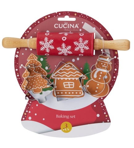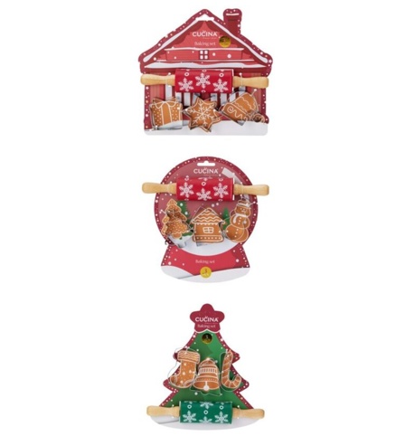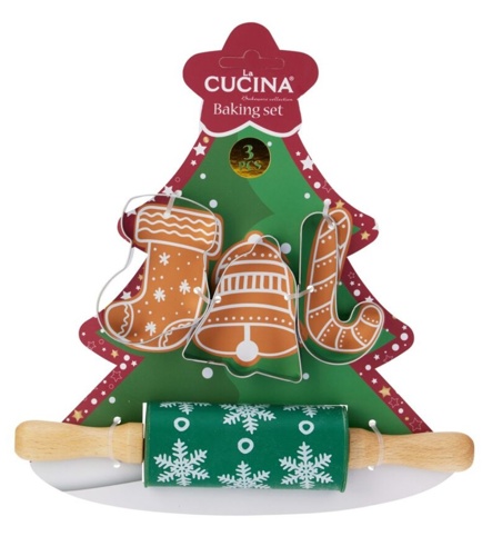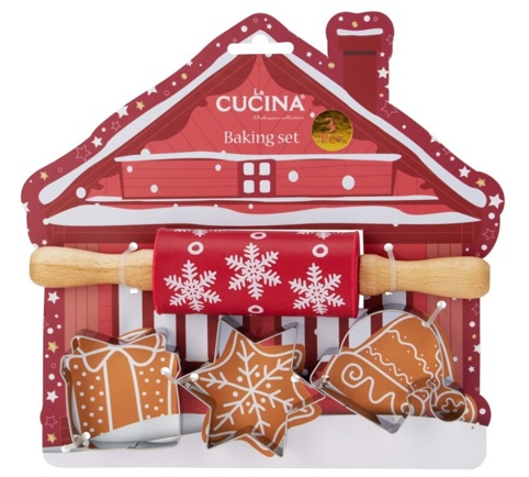 Her finder du et bagesæt, som er helt perfekt til at bage forskellige julesmåkager. Sættet består af 4 dele, hvor du får 1 x kagerulle (L: 22,5 cm) og 3 x forskellige kageudstikkere med julemotiver. Kagerullen er fremstillet af silikone med træhåndtag, og kageudstikkerne er fremstillet af rustfrit stål. Denne vare er assorteret, og du kan ikke vælge farve online.