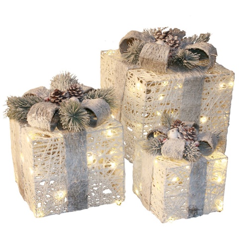 Giv hjemmet et strålende og festligt touch med dette stilfulde sæt af 3 dekorative julepakker. Hver pakke er udsmykket med varmhvidt LED-lys og pyntet med gran, kogler, hvide bær og en elegant sløjfe – perfekt til at skabe en hyggelig julestemning på mørke vinteraftener. Pakkerne tilsluttes en 230V stikkontakt – de 3 pakker er serieforbundet, så du kun behøver én stikkontakt. Produktet opfylder EN71-2-, RoHS- og REACH-standarder.