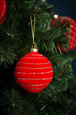 Rød julekugle med fine, små guldglimmer striber