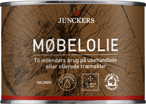 <h2>Plej træmøblerne med Junckers’ møbelolie</h2><p>Møbelolien fra Junckers vil give en dyb glød samt skabe en vand- og smudsafvisende overflade. Olien er til grunding og færdigoliering af indendørs træmøbler, både ubehandlede og tidligere olierede. Den er Indeklimamærket og kan overlakeres, både med Junckers’ vand- eller oliebaserede møbellak. OBS: Farveudtrykket på en træoverflade kan, afhængig af træsort, variere fra de viste fotos. Udfør altid en test før oliering af hele overfladen.<br><br>Til at påføre møbelolien kan du bruge en klud, pensel eller rulle. Efter brug rengøres værktøjet med mineralsk terpentin. Olien er klar til genbehandling efter 16-24 timer, og 24 timer efter færdigbehandlingen er møblet klar til brug. Eventuel tildækning bør dog først anvendes, når olien er fuldt hærdet 72 timer efter. Se PDF-produktinformationen for yderligere vejledning.<br><br>OBS: Risiko for selvantændelse: Efter brug af olien bør anvendt værktøj (klude, pensler m.v.) opbevares i en brandsikker beholder (kan være syltetøjsglas, metaldåse med tætomsluttende låg). Emballagen lukkes omhyggeligt, også når den er tom.</p>