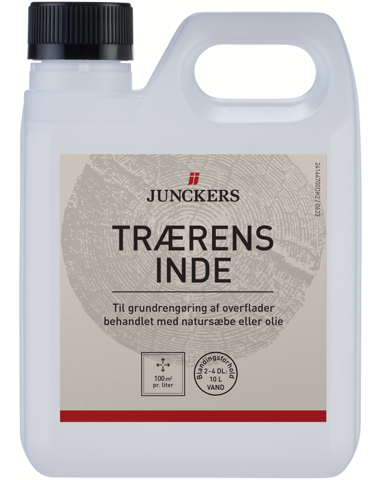 Trærens Inde fra Junckers vil rense og sikre en ensartet, flot finish, så der er en god basis for den efterfølgende behandling. Rensen er til grundrengøring af indendørs træoverflader behandlet med bivoks, natursæbe eller olie. Her vil den effektivt afrense og fjerne snavs, fedtrester og gammel sæbelim. Produktet er ligeledes velegnet til pletfjernelse på natursæbe-behandlede overflader.