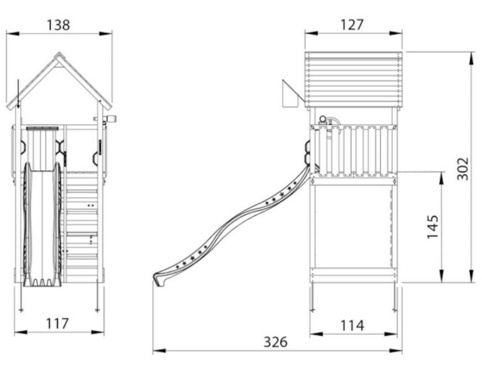 Legetårnet er testet og overvåget for kvalitet og sikkerhed (i henhold til EN: 71-1, 2, 3, 8 & 9), og det er CE- godkendt. Tårnet måler D: 326 cm x B: 138 cm x H: 302 cm. Der må maks. være 6 børn ad gangen på tårnet, og det må maks. belastes med 50 kg pr. person.
