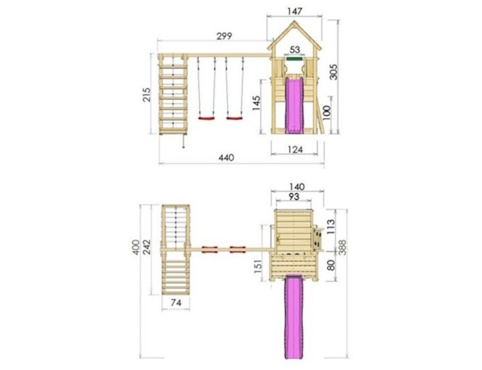 Dette legetårn fra Jungle Gym har målene D: 400 cm x B: 440 cm x H: 305 cm, og det er udstyret med et klatremodul, som måler D: 215 cm x B: 287 cm x H: 238 cm. Derudover har både tårnet og klatrestativet et sikkerhedsareal, som hver måler hhv. 200 x 200 cm og 200 x 225 cm. Vi anbefaler, at der højest er 11 personer i tårnet ad gangen, og at brugervægten er maks. 50 kg. De øvrige elementer måler følgende:
