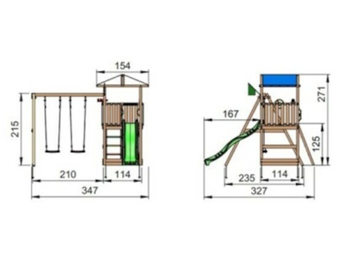 Den øvre platform er ekstra bred og har en ståhøjde på 160 cm, som gør, at der er mere plads til leg i toppen af tårnet. Dette produkt er EN 71-1, -2, -3, -8 og -9-godkendt, som vidner om optimal sikkerhed og kvalitet i henhold til EUs sikkerhedsstandarder. Du kan derfor trygt slippe børnene løs i tårnet. Dette legetårn findes i flere varianter, som er med og uden rutsjebane. Du kan derfor nemt finde et produkt, som lever op til familiens behov. Der er to sikkerhedsarealer til legetårnet og gyngemodulet, som begge måler 200 x 200 cm. Øvrige mål: