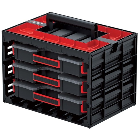 Denne værktøjskasse kan du bruge til at opbevare alle de små dele, som du har til dit værktøj. Det er f.eks. bor, skruer, bits og andet. Der medfølger hele 3 separate sortimentskasser, som du kan opbevare i værktøjskassen. Værktøjskassen kan du hænge op på væggen, så kassen kan bruges som hylde med udtrækkelige sortimentskasser. Den har også et ergonomisk håndtag, så den kan bæres rundt. Derudover kan den stables med andre værktøjskasser. Værktøjskassen er lavet af holdbar polymerblanding.