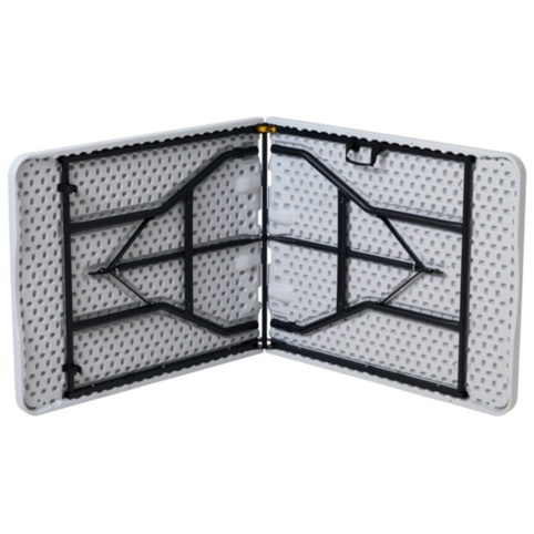 Bordpladen er lavet af plast i en diskret lysegrå farve, mens de sortlakerede stålben giver et moderne og stilrent udseende. Benene er udstyret med plastikdupper, der sikrer, at bordet står stabilt, selv på græs eller ujævnt underlag. Med det praktiske håndtag er det let at transportere, af én person, og bordet vejer kun 10 kg.