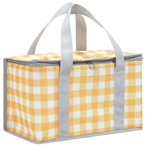 Med denne gule køletaske kan du holde din mad og dine drikkevarer friske, når skal på udflugt – perfekt til lange kørerturer, camping, picnic m.m. Køletasken kan rumme 8 L, og dimensionerne på den er H: 20 cm x B: 35 cm x D: 19,5 cm. Køletasken er derudover foret med aluminiumfolie, som giver en super-god køleeffekt. Tasken har et fint ternet design.