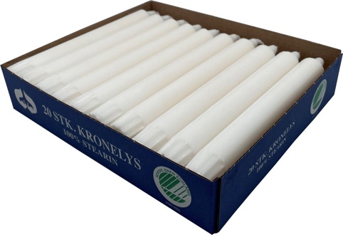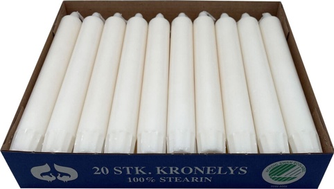 Skab stemning ved bordet eller i vinduet med klassiske kronelys i ren stearin. Lysene har en slank profil, der passer elegant i de fleste lysestager, og den solide stearin giver en pæn, rolig flamme til både hverdag og fest.