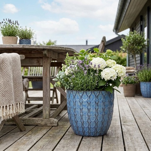 Krukker hjælper til at tilføje farver til indretningen – specielt denne blålige krukke med en glaseret overflade og mønster af blade. Du kan plante smukke, farverige blomster eller mindre planter heri, så du kan skabe en flot oase i stuen eller på terrassen. Krukken kan både bruges inde og ude, og den passer ind i alle typer indretning og interiør.
