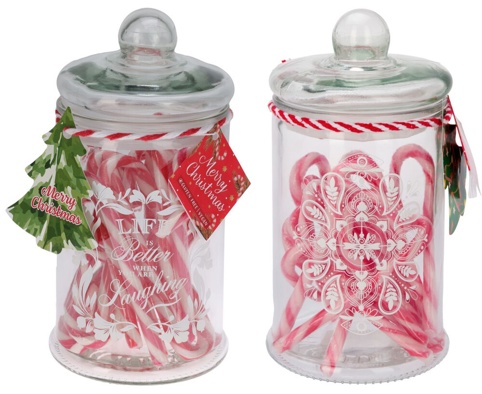 Elegant og stemningsfuld glasbeholder fyldt med 288 g klassiske røde og hvide candy canes. Krukken er pyntet med fine juleetiketter og detaljerede hvide tryk på glasset – perfekt til borddækning, gavekurve eller som hyggelig pynt i juletiden. Denne vare er assorteret, og du kan ikke vælge design online.