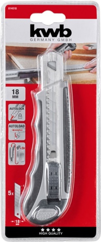Denne hobbykniv fra KWB har autolock-funktion, der automatisk låser knivbladet fast under brug for en sikker og stabil skæring. Den har også en autoload-funktion, så du hurtigt og nemt kan fjerne det brugte knivblad og automatisk fremføre en ny fra det integrerede magasin. Skinnen, som knivbladet sidder i, er i robust rustfrit stål, mens det 2-komponente greb har en skridsikker overflade for et godt og sikkert greb. Hobbykniven leveres med 5 knivblade, der kan opbevares i det integrerede magasin.