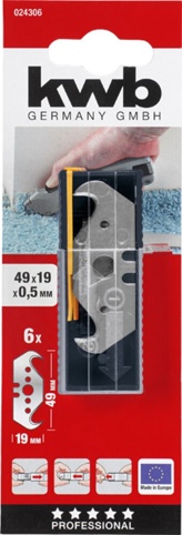 Dette KWB-knivblad er til standard universal- og hobbyknive og er velegnet til skæring i tæpper. Det er specialhærdet under meget lave temperaturer (ice hardened) for at give en høj hårdhed og lang levetid. Skæret har fået en 3-faset slibning, der giver præcise og rene snit. Bladet er et krogblad med målene 19 x 49 mm og en tykkelse på 0,5 mm. Én pakke indeholder 6 stk. krogblade, der leveres i en praktisk beholder.