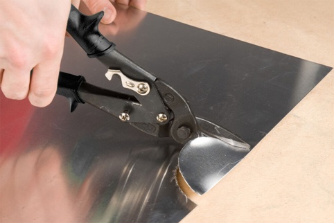 Denne pladesaks har højreskær. Den kan bruges til brede kurver og korte, lige snit. Pladesaksen kan klippe i metalplader op til 1,5 mm og rustfri plader op til 1,0 mm.