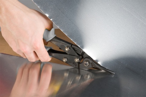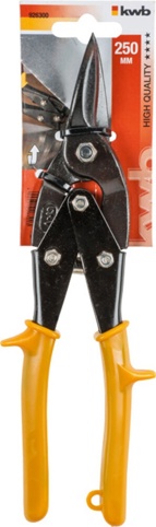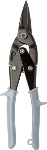 Denne pladesaks har ligeskær. Den kan bruges til brede kurver og korte, lige snit. Pladesaksen kan klippe i metalplader op til 1,5 mm og rustfri plader op til 1,0 mm.