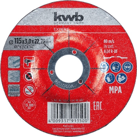 Med denne skæreskive fra KWB til vinkelsliber kan du skære præcise snit i mange forskellige typer af metal, f.eks. aluminium, stål og jern. Skiven har et aluminiumoxidkorn, som gør den til et solidt slibemiddel med høj skæreydelse og lang levetid. Skæreskiven måler Ø115 mm, har en huldiameter på 22 mm og kan yde maks. 13.300 rotationer/min. Den passer til standardvinkelslibere med en hastighed på 80 m/sek.