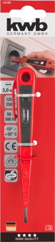 Spændingstesteren er udstyret med en 3,0 mm kærv og et 150 mm langt skaft, som gør den praktisk til mange almindelige elopgaver. Den integrerede håndbeskyttelse hele vejen rundt giver ekstra sikkerhed under arbejdet og minimerer risikoen for at glide frem mod spidsen. VDE GS-certificeringen er din garanti for, at værktøjet lever op til gældende sikkerhedskrav.