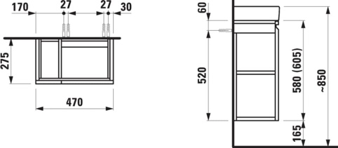 Underskabet leveres uden håndvask. Det passer perfekt til Laufen Pro S asymmetrisk håndvask, der måler 48x28 cm (købes separat). Pro S-underskabet kommer inkl. monteringsmateriale til væghængning. Fødder kan tilkøbes og monteres på skabet, f.eks. i tilfælde af din væg ikke kan tåle møblets vægt. Målene på underskabet er B: 47 cm x D: 27,5 cm x H: 60,5 cm.