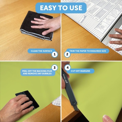 Klæbefolien fra Lenco Denco er nem at sætte op på den overflade, som du gerne vil dekorere. Begynd med at rengøre overfladen, så den er tør og fri for støv. Beskær derefter papiret til den størrelse, du skal bruge – her er det en god idé at bruge lineal og en hobbykniv for at få det mest præcise resultat. Når folien er skåret til, kan du forsigtigt trække bagsidefilmen af og klæbe folien til overfladen. Brug gerne en folieskraber til at fjerne luftbobler, så resultatet bliver helt glat og fint.