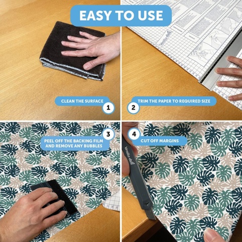 Klæbefolien fra Lenco Denco er nem at sætte op på den overflade, som du gerne vil dekorere. Begynd med at rengøre overfladen, så den er tør og fri for støv. Beskær derefter papiret til den størrelse, du skal bruge – her er det en god idé at bruge lineal og en hobbykniv for at få det mest præcise resultat. Når folien er skåret til, kan du forsigtigt trække bagsidefilmen af, og klæbe folien til overfladen. Brug gerne en folieskraber til at fjerne luftbobler, så resultatet bliver helt glat og fint.
